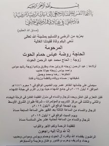 غرندين : توفّيت الحاجة، روضة عباس حمام الحوت، زوجة رئيس مجلس إدارة – مدير عام شركة “طيران الشرق الأوسط” محمّد الحوت.